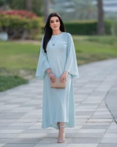 وظهرت ليال باطلالة ناعمة،مرتدية عباءة لون ازرق سماوي ،تاركة شعرها منسدلا على كتفيها.