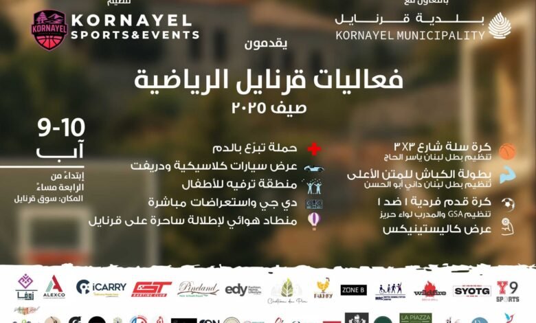 في مبادرة مميزة تعكس روح التعاون والانفتاح، تنظم *بلدية قرنايل* بالتعاون مع *Kornayel Sports & Events* فعاليات *”قرنايل الرياضية – صيف 2025″* على مدى يومين، في *9 و10 آب*، في *سوق قرنايل* ابتداءً من الساعة الرابعة عصراً.