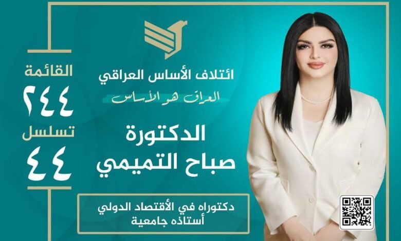 في خطوة تعكس التزامها المستمر بخدمة الشعب العراقي، أعلنت النائبة السابقة والناشطة السياسية *الدكتورة صباح التميمي* ترشحها الرسمي لانتخابات مجلس النواب العراقي المقبلة، وذلك ضمن *”ائتلاف الأساس العراقي”*.