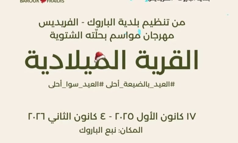 في أجواء من البهجة والترقب، أعلنت بلدية الباروك – الفريديس عبر حسابها الرسمي على إنستاغرام عن انطلاق فعاليات “القرية الميلادية” ضمن مهرجان مواسم بحلّته الشتوية، تحت شعار *#العيد_بالضيعة_أحلى و#العيد_سوا_أحلى .