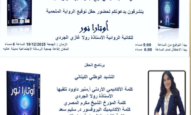 برعاية بلدية عاليه وبالتعاون مع اتحاد الكتّاب اللبنانيين، مجلة صياد المعرفة الإلكترونية، ونادي الكتّاب اللبناني – فرع د. نازك أبو علوان عابد، يُقام حفل توقيع رواية “أوتارا نور” للكاتبة الروائية الأستاذة رولا غازي الجردي وذلك يوم الجمعة في 19 كانون الأول 2025 عند الساعة الخامسة مساءً* في قاعة جمعية الرسالة الاجتماعية – عاليه.