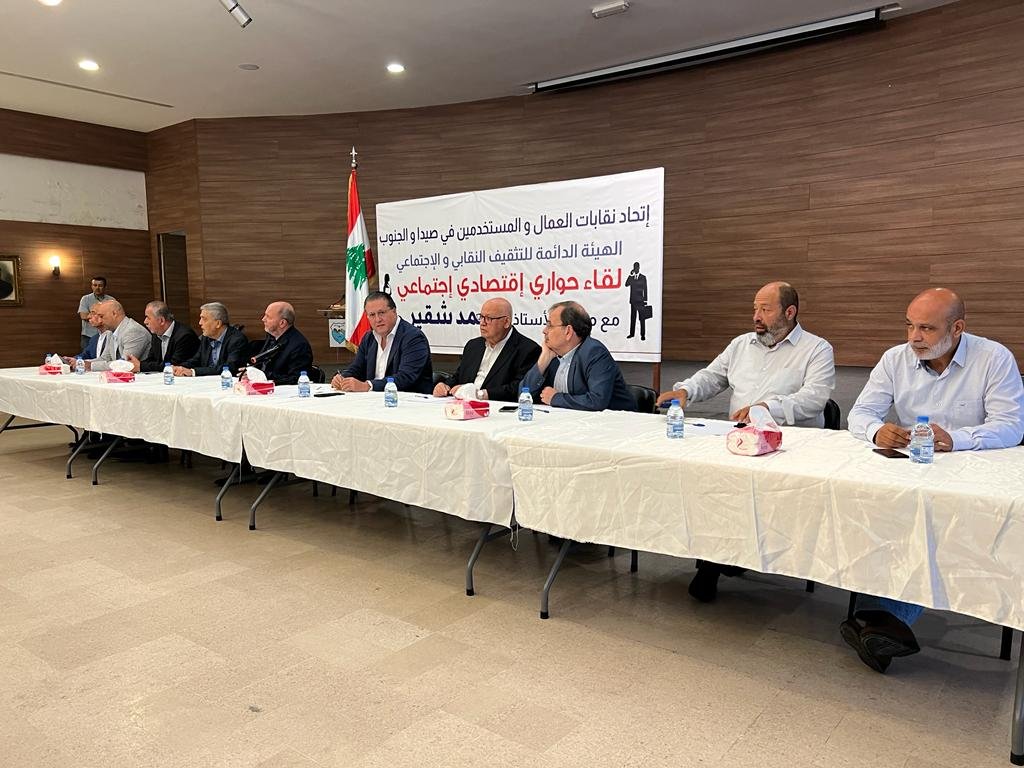 بعد ذلك توجه شقير الى قاعة بلدية صيدا تلبية لدعوة اتحاد نقابات العمال والمستخدمين في صيدا والجنوب برئاسة عبد اللطيف الترياقي، الى لقاء حواري نظمه لشقير حول الوضع الاقتصادي والاجتماعي، بمشاركة قيادات وفعاليات المدينة، ومن أبرز المشاركين: النائب عبد الرحمن البزري، ممثل النائب أسامة سعد حسين القاضي، ممثل رئيسة مؤسسة الحريري للتنمية البشرية المستدامة بهية الحريري أسامة الأرناؤوط، المسؤول السياسي للجماعة الإسلامية في الجنوب بسام حمود، رئيس بلدية صيدا محمد السعودي، رئيس الاتحاد العمالي العام بشارة الأسمر، رئيس غرفة صيدا والجنوب محمد صالح، نائب رئيس الإتحاد العمالي حسن فقيه والأمين العام للاتحاد سعد الدين حميد صقر، امين سر الهيئات الاقتصادية الفونس ديب، رئيس نقابة الصناعات الغذائية منير البساط، رئيس جمعية تجار صيدا علي الشريف، رئيس مركز الضمان في صيدا محمد خليفة، عضو المجلس الاقتصادي الاجتماعي ماجد سعيفان، منسق عام التيار في صيدا والجنوب مازن حشيشو، المسؤول العمالي لحركة أمل في الجنوب جمال جوني، أمين عام تجمع المؤسسات الأهلية في صيدا والجوار ماجد حمتو، وحشد كبير من الفعاليات النقابية والإقتصادية والإجتماعية، وفعاليات فلسطينية.