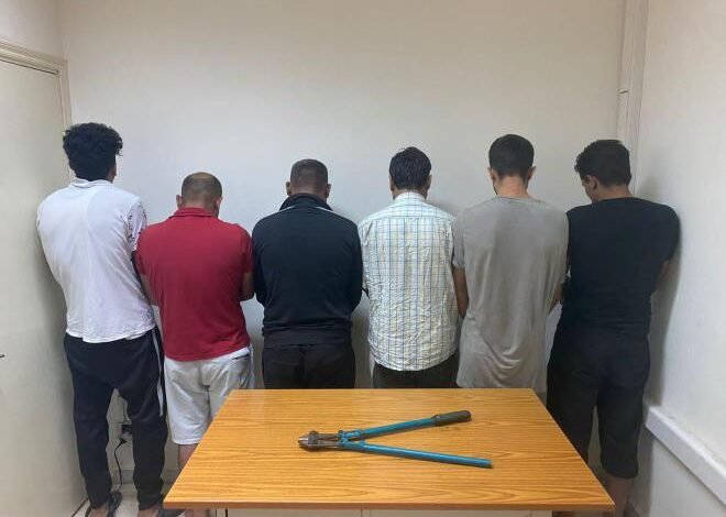نفّذت قوة من شعبة المعلومات في قوى الأمن الداخلي لعمليات سرقة الأسلاك الكهربائية عن الشبكة العامة لمؤسسة كهرباء لبنان في مختلف المناطق اللبنانية وملاحقة المتورطين بها وتوقيفهم، كمائن ومداهمات في مناطق عاليه وبشامون وبرّ الياس بعد عمليات رصد ومراقبة دقيقة، نتج عنها توقيف م. م. (مواليد عام ١٩٩٤)، أ. ق. (مواليد عام ۲۰۰۱)، أ. ع. (مواليد عام ١٩٨٦)، م. ح. (مواليد عام ۱۹۷۹)، ع. ع. (مواليد عام ١٩٩٩)، و ت. د. (مواليد عام ١٩٨٦).