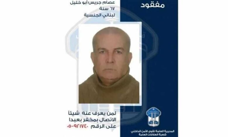 عمّمت المديريّة العامّة لقوى الأمن الداخلي بناءً على إشارة القضاء المختص صورة المفقود عصام جريس أبو خليل (1956، لبناني) الذّي غادر منذ حوالى 5 أيّام منزله الكائن في الحدت، ولم يَعُد لغاية تاريخه، مع العلم أنّه يعاني من اضطرابات عصبيّة.