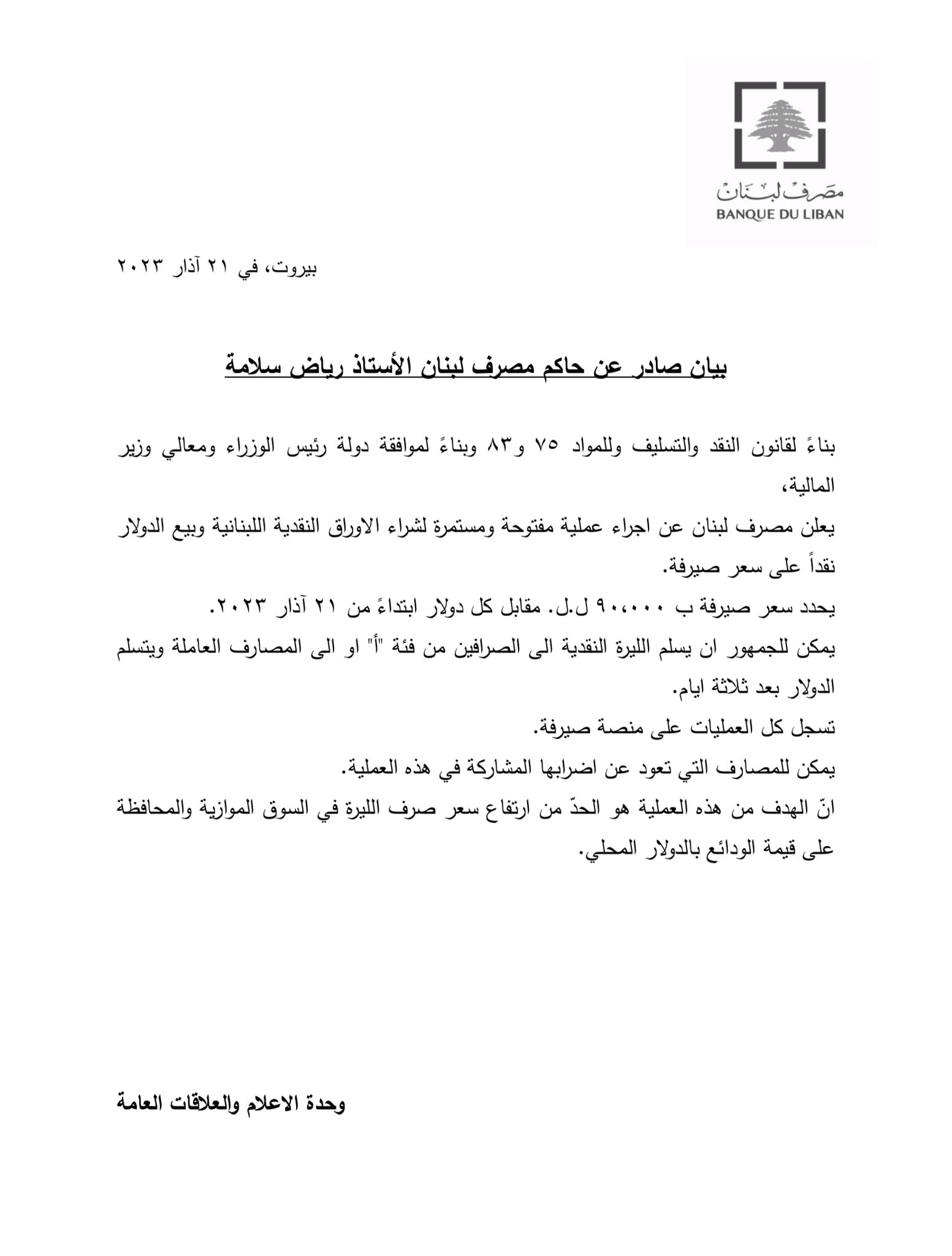 يُعلن مصرف لبنان عن إجراء عمليذة مفتوحة ومستمرّة لشراء الأوراق النقديّة اللبنانيّة وبيع الدولار نقداً على سعر “صيرفة”، ويُحدّد بـ90 ألف ليرة مقابل كلّ دولار ابتداءً من تاريخ اليوم.