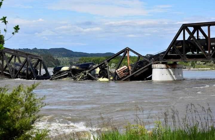 تسبب انهيار جسر فوق نهر يلوستون في ولاية في مونتانا، بسقوط عدة عربات قطار محملة بمواد خطرة في النهر.