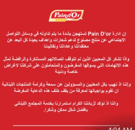 إن ادارة Pain D’or تستهجن بشدة ما يتم تداوله في وسائل التواصل الاجتماعي عن منتج مصنوع لدعم شعارات واهداف بعيدة كل البعد عن معتقداتنا وعاداتنا وتقاليدنا.