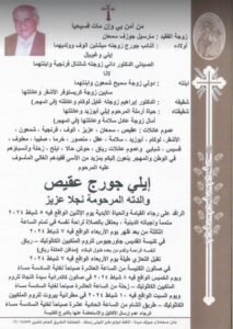 ويحتفل بالصلاة لراحة نفسه في تمام الساعة الثالثة من بعد ظهر يوم الأربعاء الواقع فيه 7 شباط 2024 في كنيسة القديس جاورجيوس للروم الكاثوليك ـ رياق