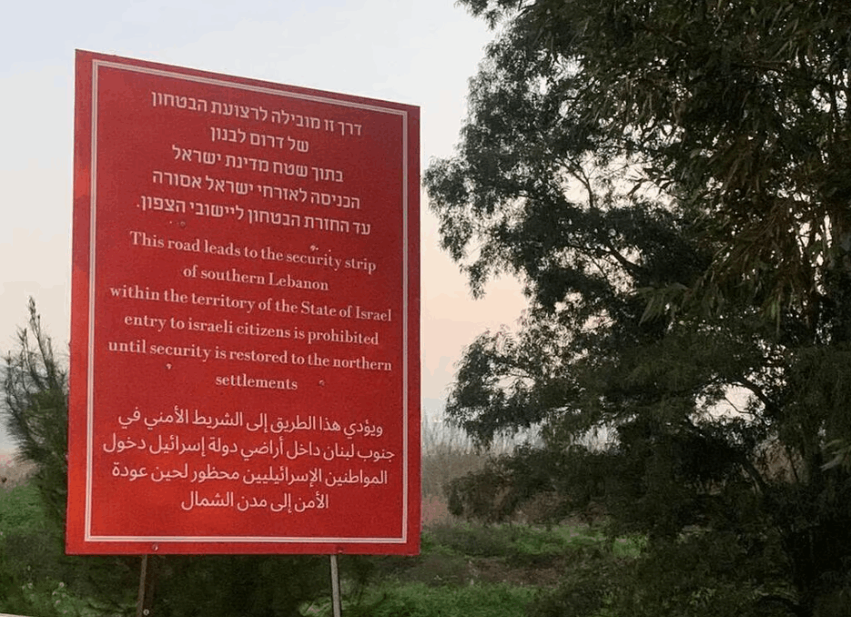 وحسب الموقع وضعت اللافتات عند مدخل كريات شمونة ومستوطنات أخرى في الشمال، ومكتوب عليها باللغات العبرية والإنجليزية والعربية: “هذا الطريق يؤدي إلى الشريط الأمني لجنوب لبنان داخل أراضي دولة إسرائيل. ويمنع دخول المواطنين الإسرائيليين حتى استعادة الأمن في المستوطنات الشمالية”.