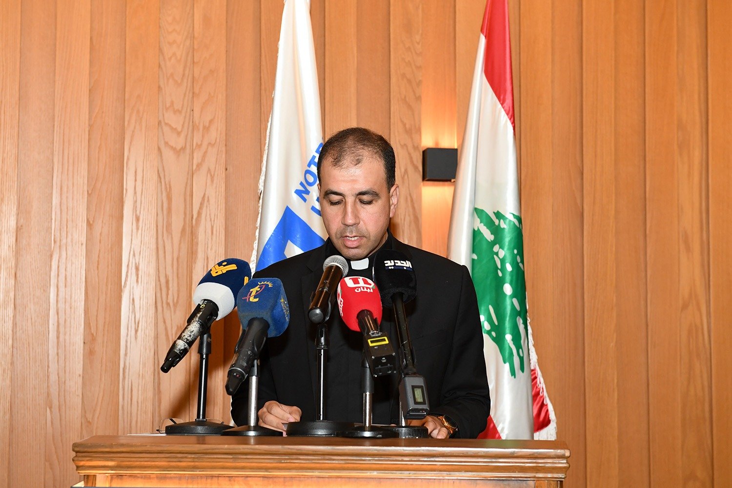 ثم كان لرئيس جامعة سيّدة اللويزة الاب بشارة الخوري كلمة رحب فيها بالحضور قائلاً: “نحنُ هنا اليومَ لنقولَ أشياءَ كثيرةً ذات صلةٍ برسالتَيْنا: