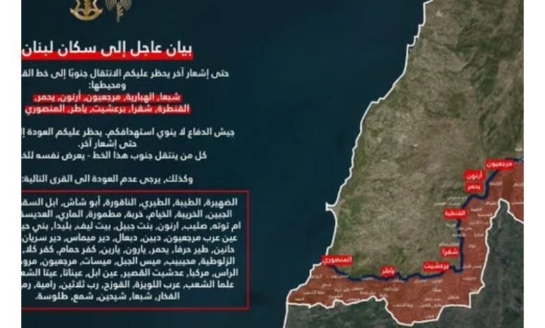 وتابع: “كذلك يرجى عدم العودة الى القرى التالية: الضهيرة, الطيبة, الطيري, الناقورة, أبو شاش, ابل السقي, البياضة, الجبين, الخريبة, الخيام, خربة, مطمورة, الماري, العديسة, القليعة, ام توته، صليب, ارنون, بنت جبيل, بيت ليف, بليدا, بني حيان, البستان, عين عرب مرجعيون, دبين, دبعال, دير ميماس, دير سريان, حولا, حلتا, حانين, طير حرفا, يحمر, يارون, يارين, كفر حمام, كفر كلا, كفر شوبا, الزلوطية, محيبيب, ميس الجبل, ميسات, مرجعيون, مروحين, مارون الراس, مركبا, عدشيت القصير, عين ابل, عيناتا, عيتا الشعب, عيترون, علما الشعب, عرب اللويزة, القوزح, رب ثلاثين, رامية, رميش, راشيا الفخار, شبعا, شيحين, شمع, طلوسة.