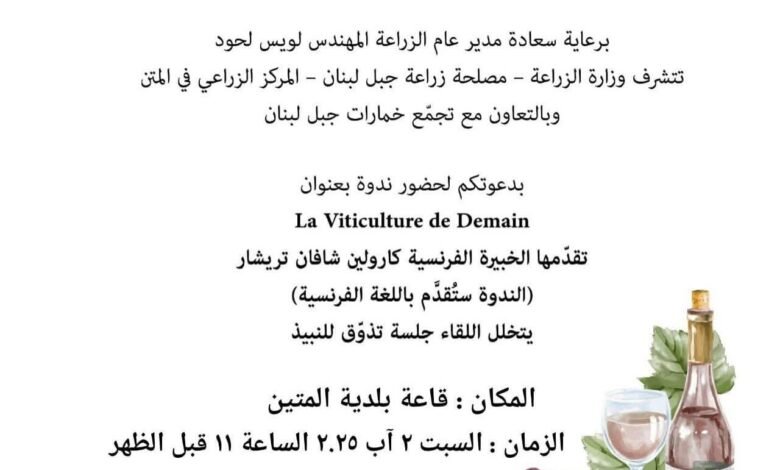برعاية سعادة مدير عام الزراعة المهندس لويس لحود، تنظّم وزارة الزراعة – مصلحة زراعة جبل لبنان، بالتعاون مع تجمّع خمّارات جبل لبنان، ندوة متخصصة بعنوان *”La Viticulture de Demain”* (زراعة الكرمة في الغد)، وذلك نهار *السبت الواقع في ٢ آب ٢٠٢٥*، في قاعة بلدية المتين – الساعة 11 قبل الظهر.